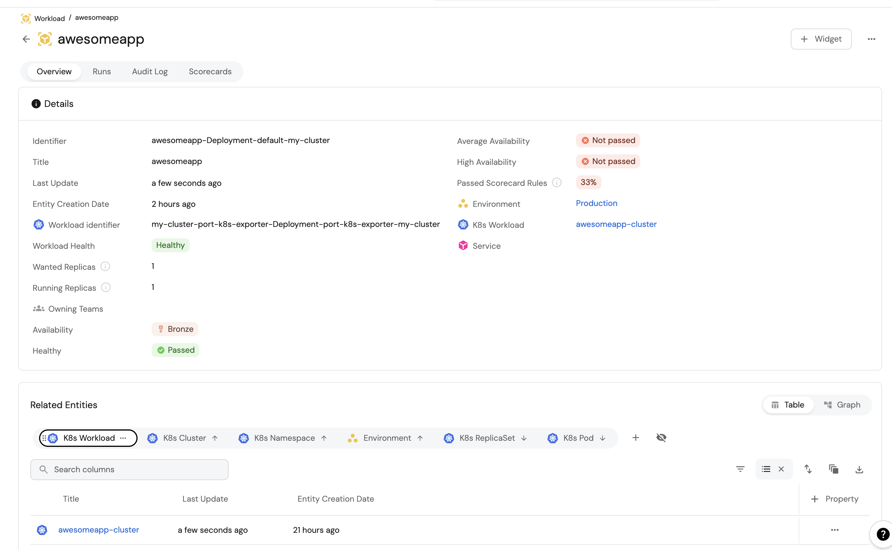 Create scorecards for the blueprints that represent your K8s resources (as defined here). These scorecards define rules and checks over the data ingested from your K8s cluster, making it easy to check that your K8s resources meet your standards.